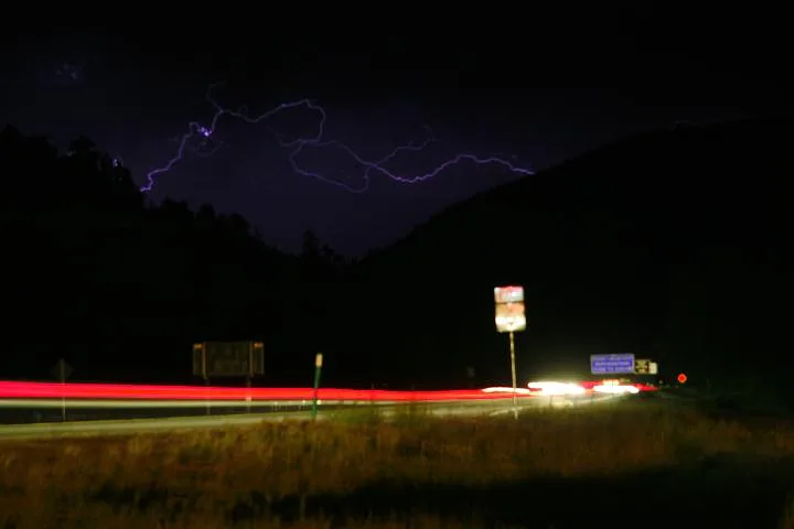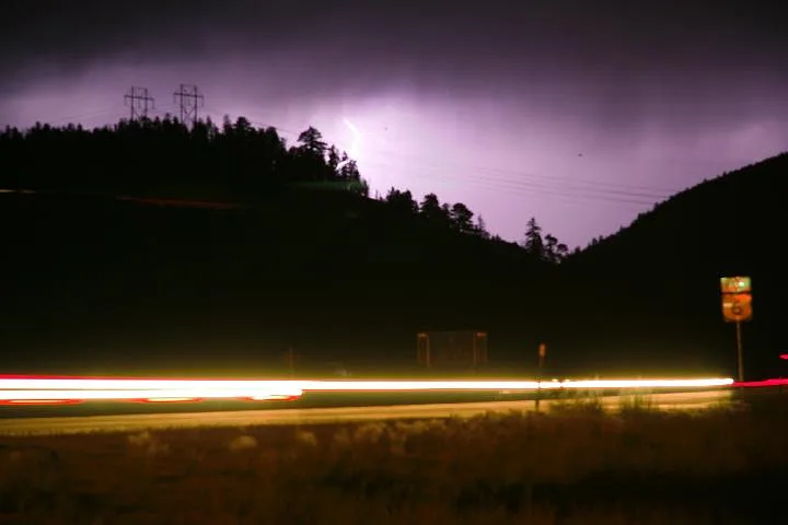 On a trip to Colorado, my friends and I noticed that just about every night, the peaks surrounding our apartment in The Rockies were alive with dry lightning storms. I borrowed a remote shutter and would leave the aperture open for up to five minutes, letting it snap shut the instant we saw a flash.